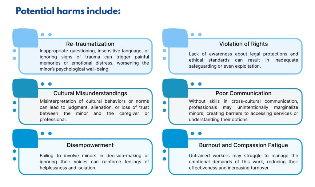 Working with unaccompanied refugee minors requires specialized skills and knowledge. Without adequate training in trauma-informed care, cultural sensitivity, and child protection, professionals risk unintentionally causing further harm to already vulnerable young people.