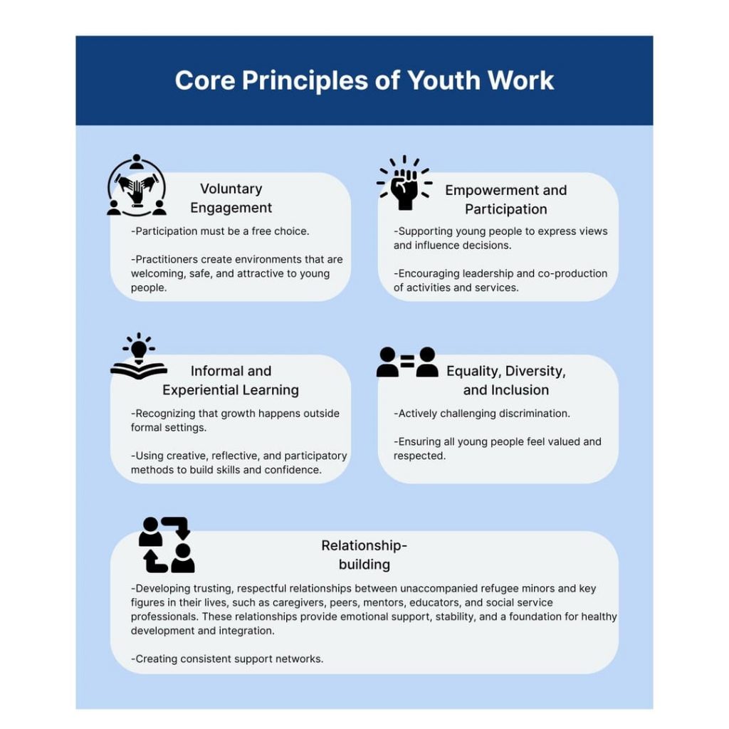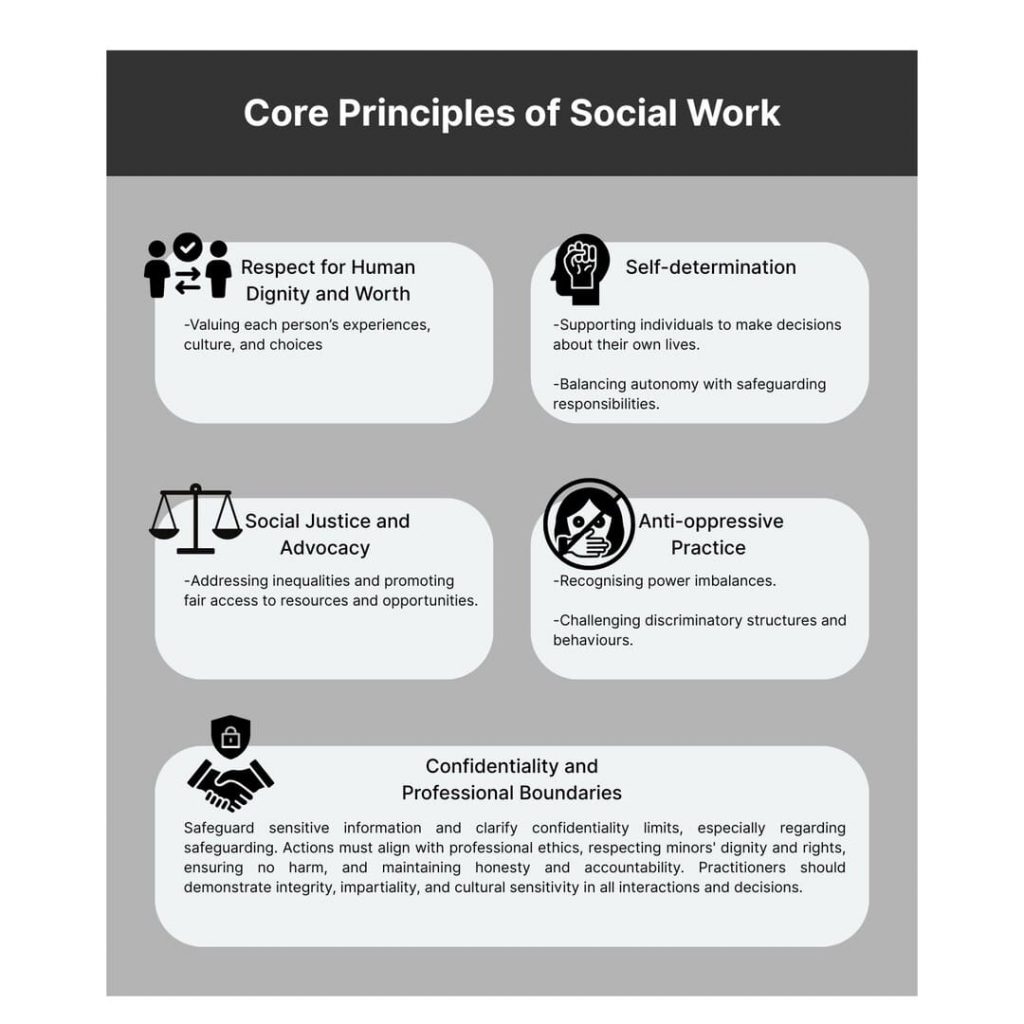Effective practice with young people and communities requires a deep understanding of the core principles that underpin both youth work and social work. While each discipline has distinct roles, they share common values centred on empowerment, rights, and social inclusion.