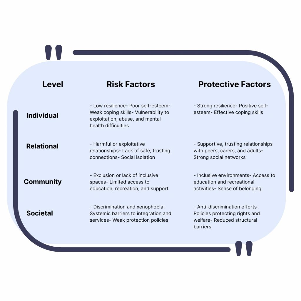 At the societal level, prevention aims to challenge discrimination, reduce systemic barriers, and advocate for policies that protect the rights and welfare of unaccompanied refugee minors.
